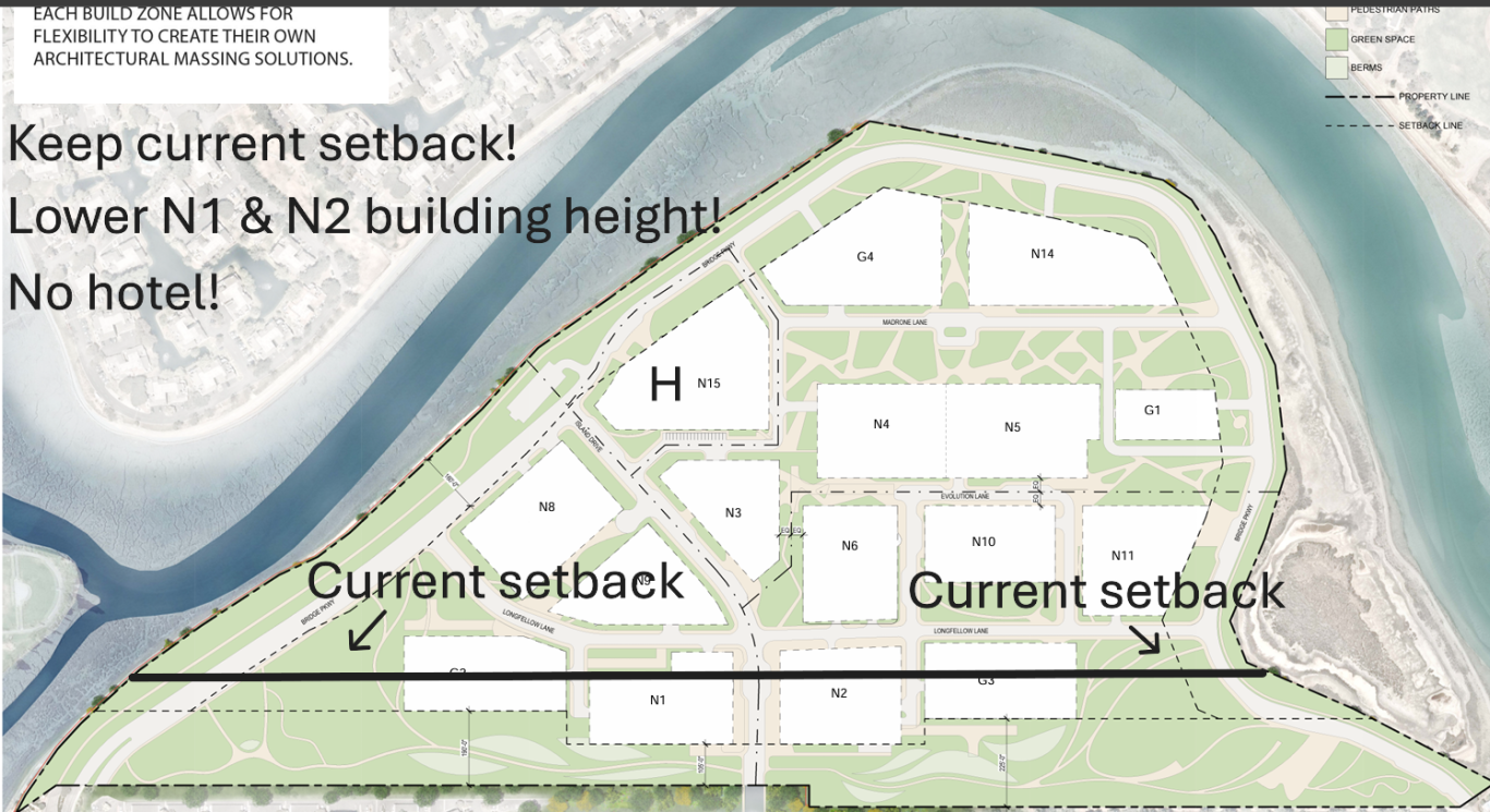 1.  Keep the current setback to keep Redwood Shores' openness unique character.